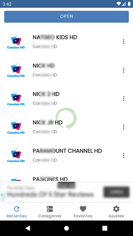 Recientes, Categorías, Favoritos y Ajustes